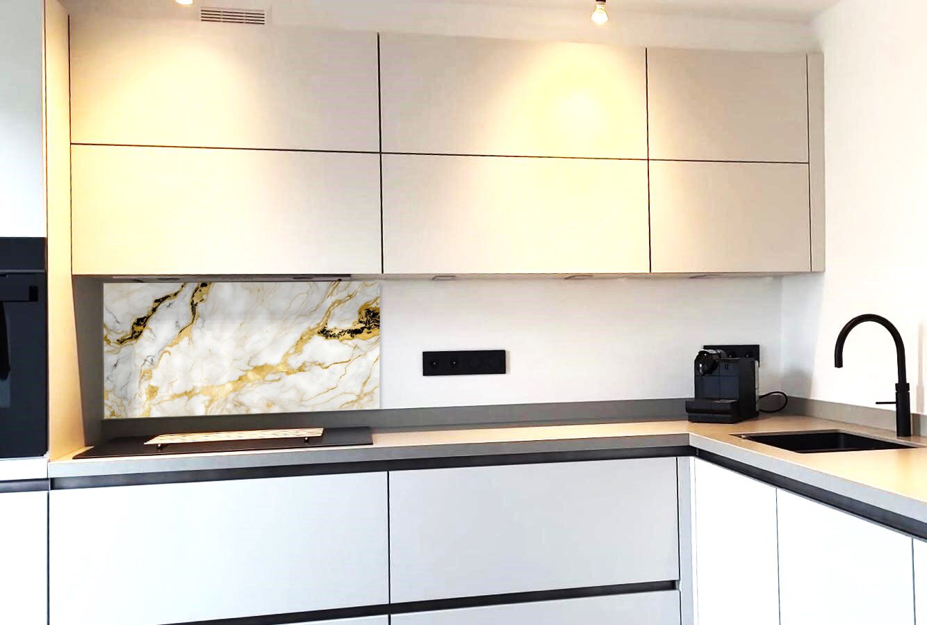 Een marmeren keuken achterwand is stijlvol en enorm hip! Veel mensen houden van een strakke, moderne en smaakvolle keuken. Deze achterwand met wit goud en zwart marmer design maakt je keuken helemaal af. Op maat gemaakt van hoogwaardig materiaal en niet van echt marmer te onderscheiden. En vele malen goedkoper dan echt marmer. Ook leuk om te combineren met een inductiebeschermer.